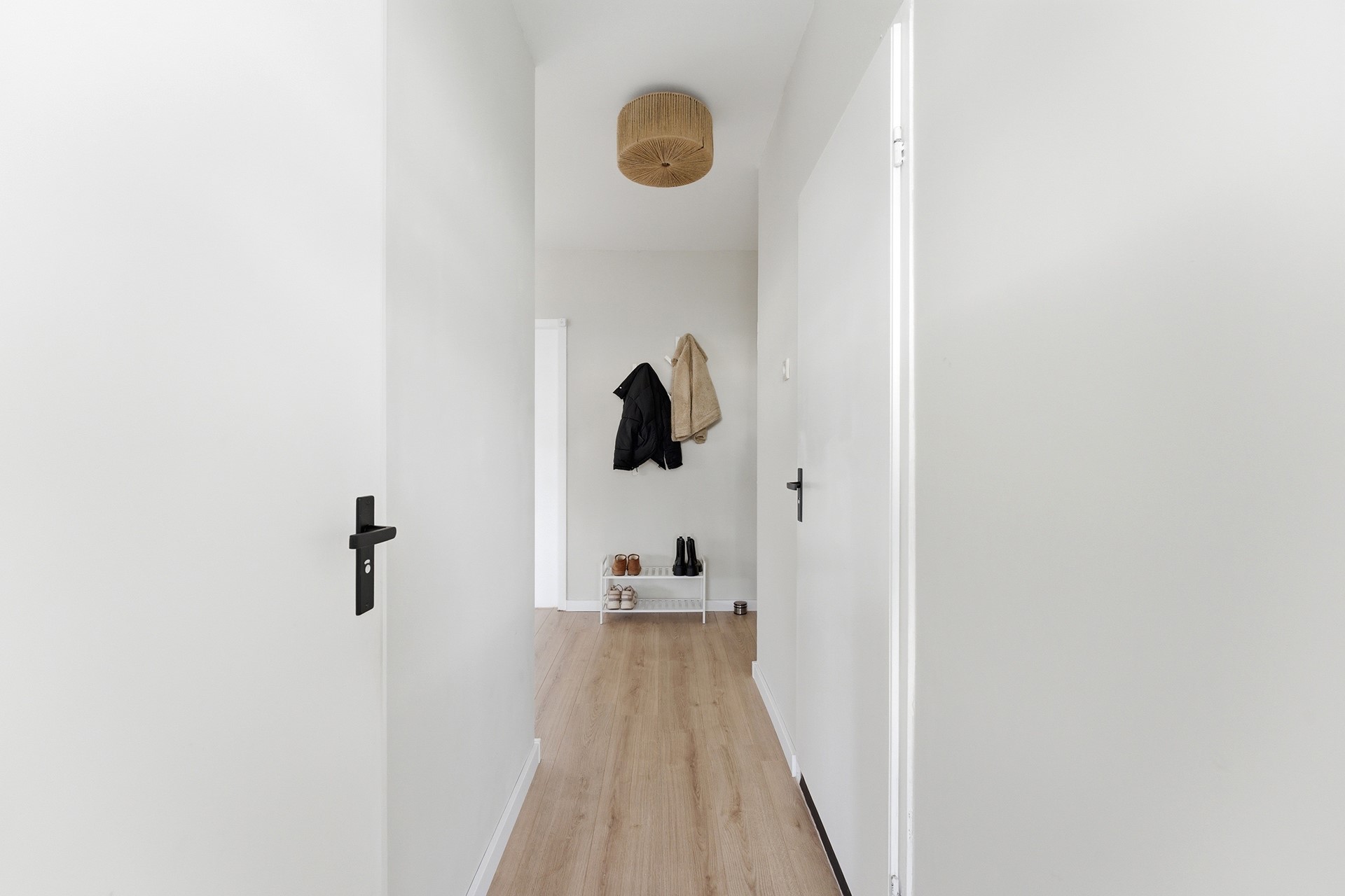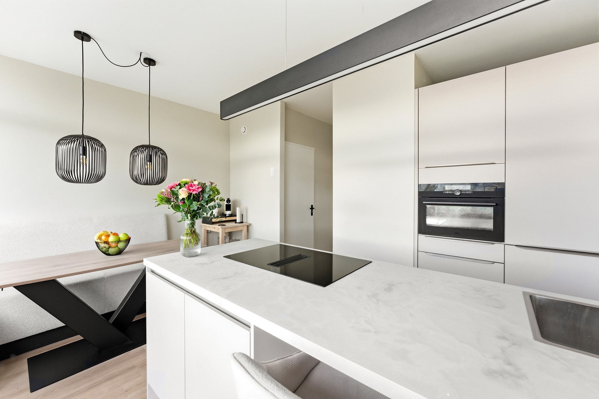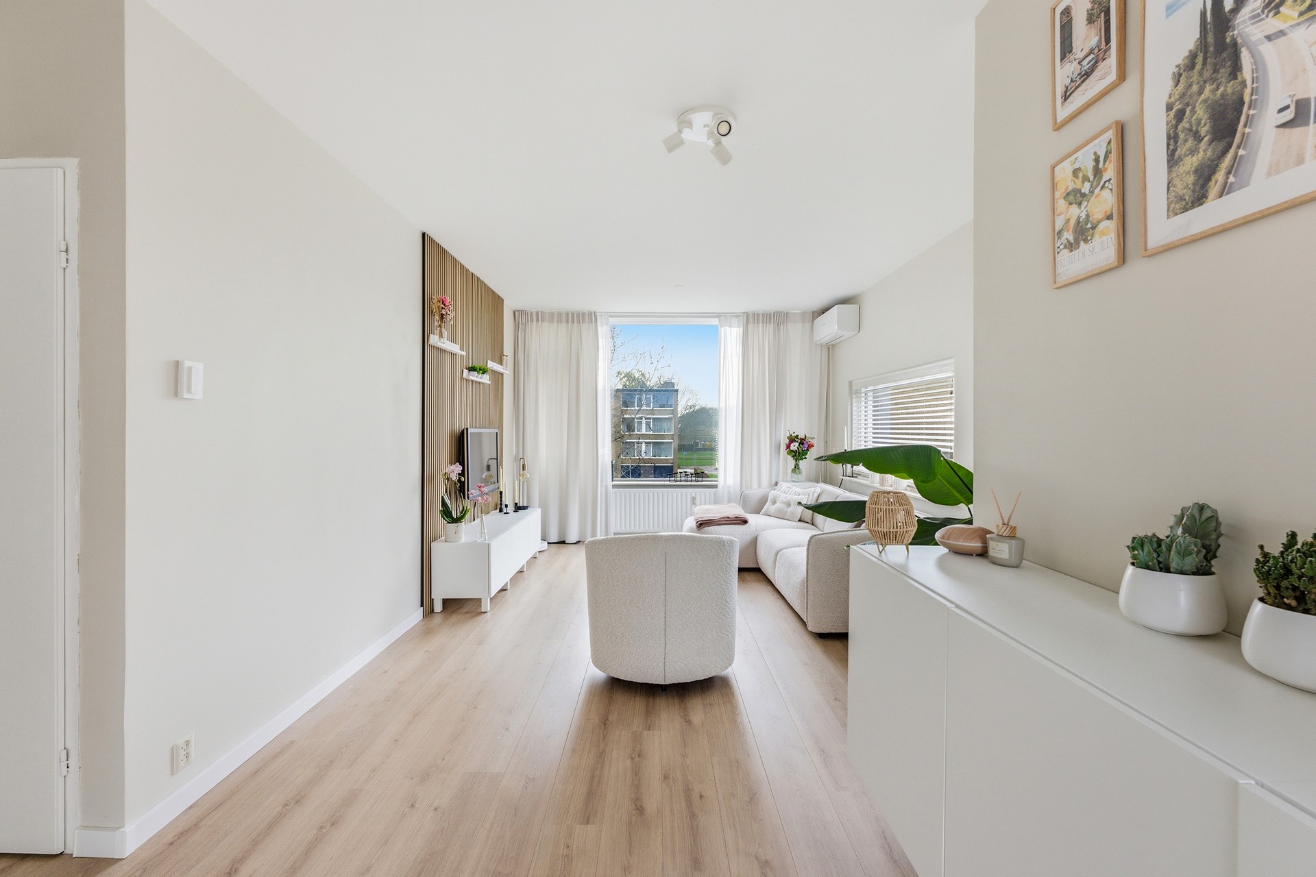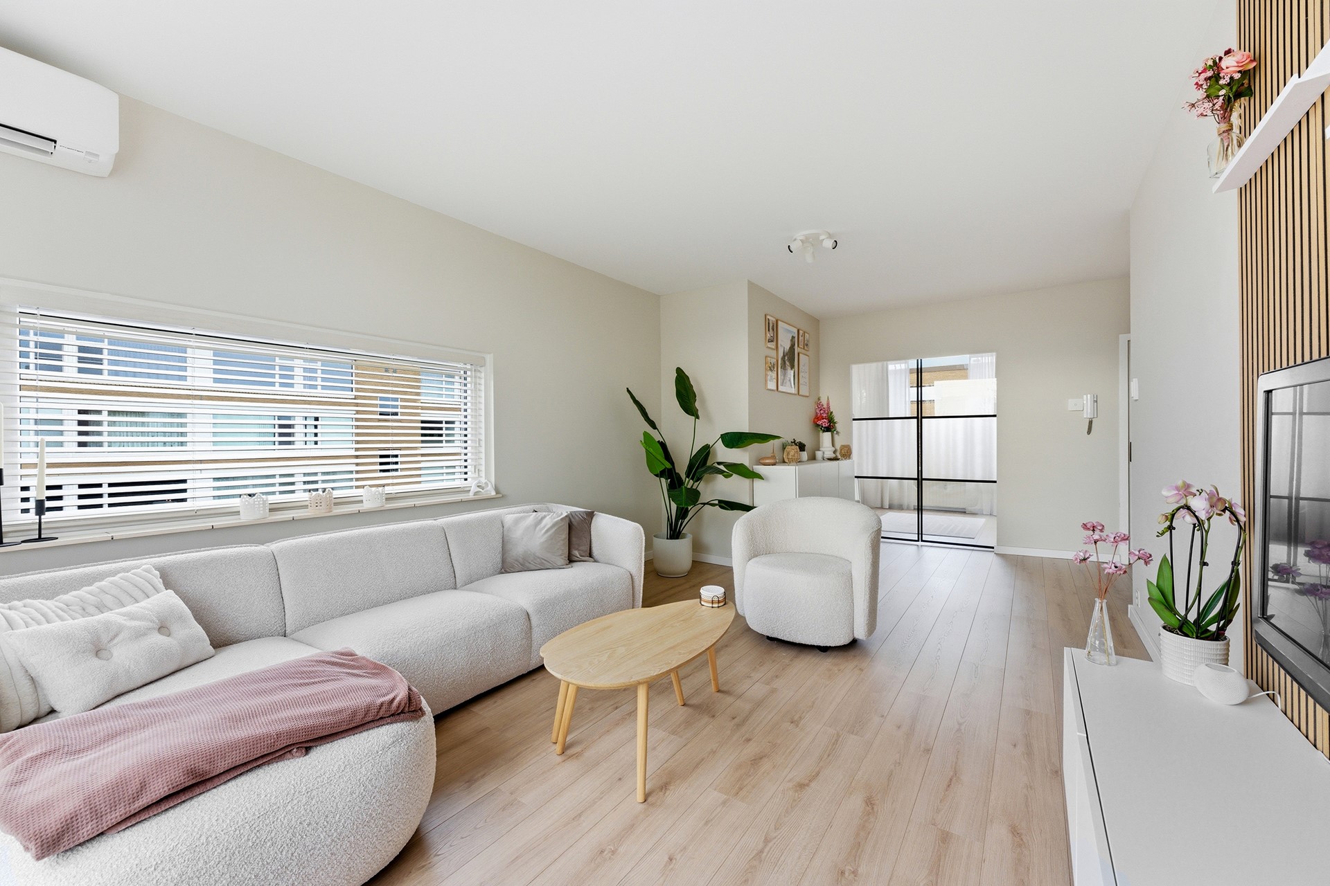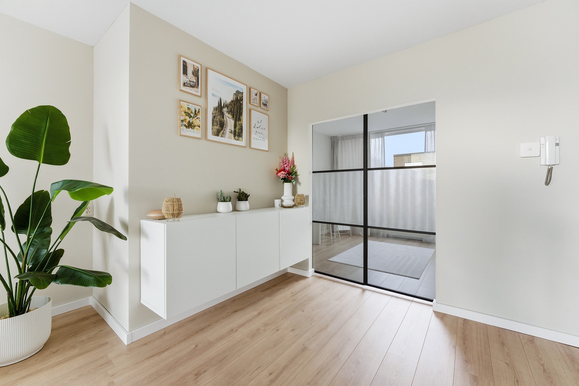 Entree van het appartement. Mooie grote ruimte met een open verbinding naar de woonkamer en toegang tot de beide slaapkamers, de badkamer, het toilet en de keuken. Prachtige woonkeuken welke in 2024 geheel nieuw is geplaatst, de keuken is voorzien van een inbouw vaatwasser, kookplaat met geïntegreerde afzuigkap, stoomoven, koelkast, vriezer en Quooker. In de keuken is een op maat gemaakte tafel en hoekbank aanwezig welke achterblijft. De badkamer is voorzien van een ruime douche en wastafelmeubel. De ruime woonkamer is voorzien van een airco die zowel voor verkoeling zorgt in de zomer als voor verwarming in de winter.