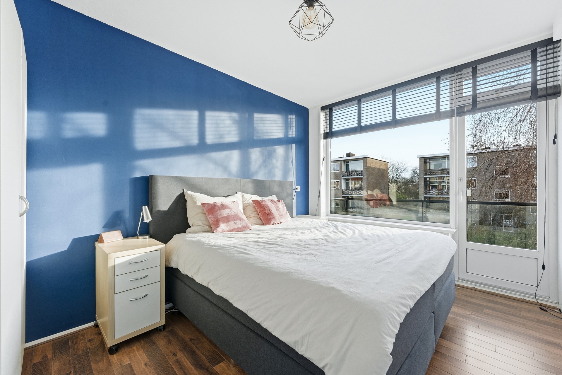 Entree in hal welke toegang geeft tot vrijwel alle vertrekken in de woning. Ruime doorzon woonkamer met vaste kast. De grote slaapkamer bevindt zich aan de voorzijde en geeft toegang tot het balkon. De tweede slaapkamer is gesitueerd aan de achterzijde en heeft een vaste kast. De keuken is eveneens gesitueerd aan de achterzijde en geeft toegang tot het tweede balkon en de badkamer. De keuken is voorzien van een kookplaat, afzuigkap en wasmachine aansluiting. De badkamer is ca. 3 jaar geleden gerenoveerd en voorzien van een douche en meubel met wastafel.
