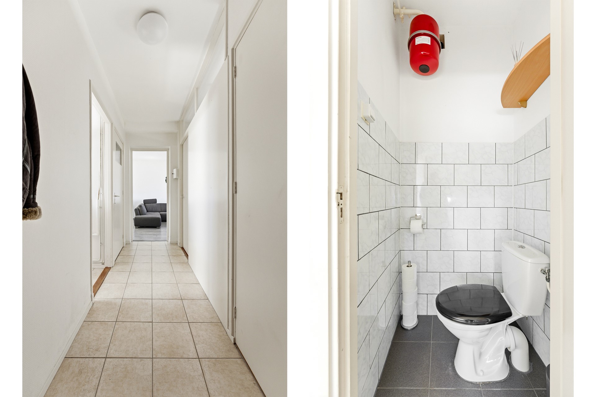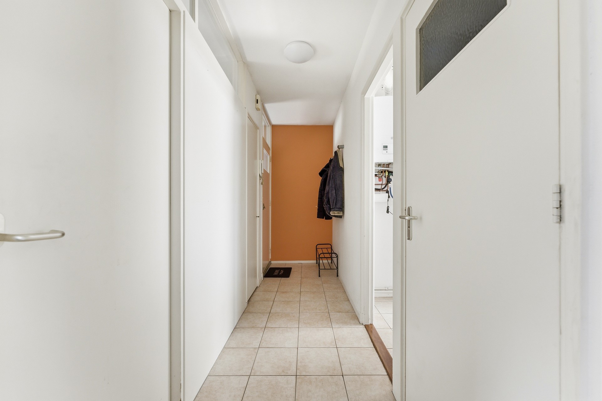 Entree van het appartement. Hal welke toegang geeft tot woonkamer, slaapkamer, keuken en toilet. Vanuit de woonkamer is het balkon aan de voorzijde en de badkamer aan de achterzijde bereikbaar. De badkamer is voorzien van een douche en meubel met wastafel. De keuken geeft toegang tot het balkon aan de achterzijde.