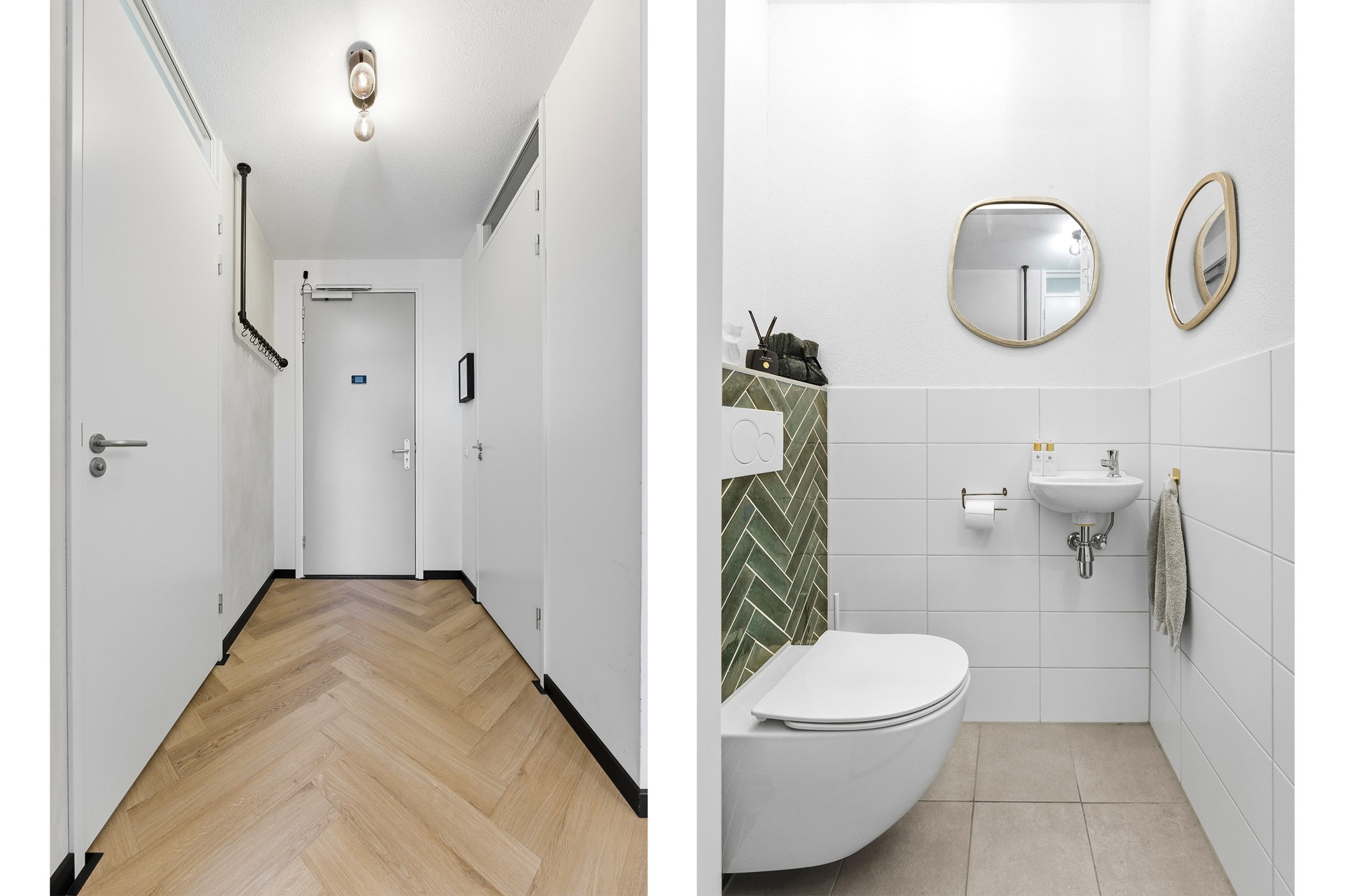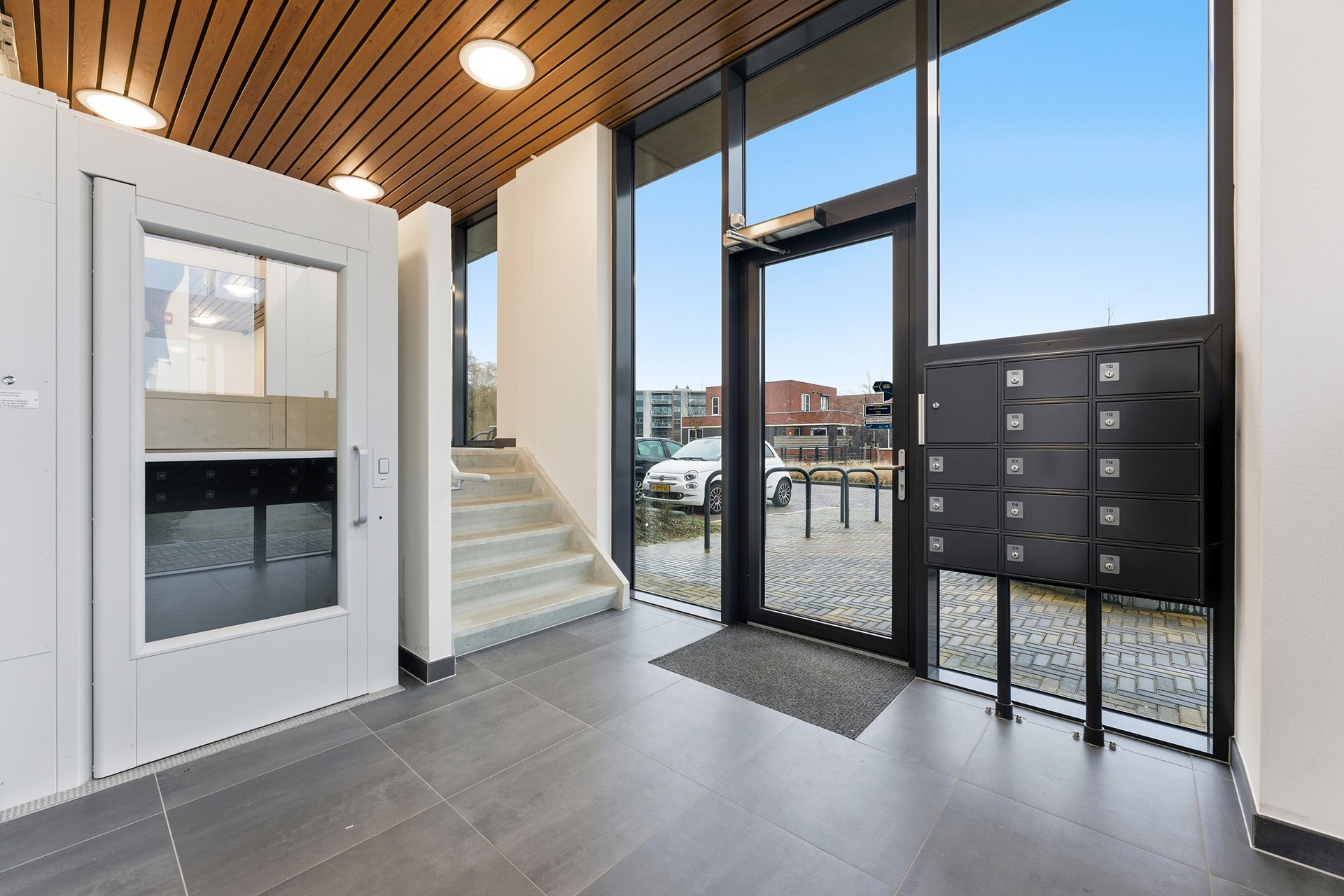Afgesloten portiek. Toegang tot de trap en lift naar de woonverdiepingen en de parkeergarage. Tevens is er toegang tot de gezamenlijke fietsenstalling.
