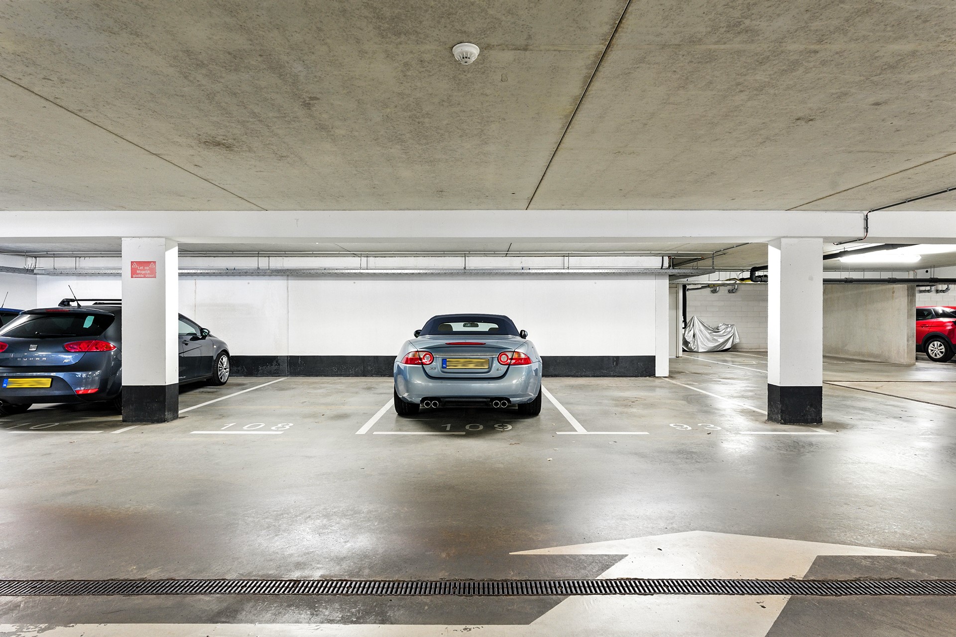 In de onderbouw van het complex bevinden zich zowel een eigen parkeerplaats (nr. 108) als een afgesloten berging (108), die beiden exclusief voor dit appartement beschikbaar zijn.
