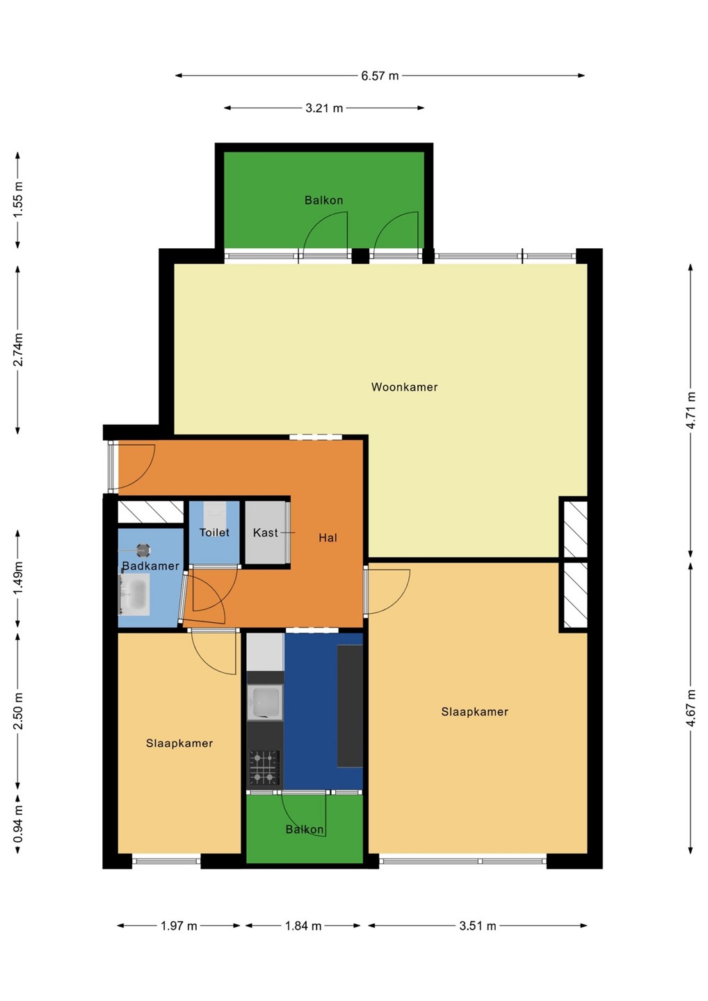 De keuken, centraal in de woning gelegen, is praktisch ingedeeld en biedt toegang tot het tweede balkon aan de voorzijde. De badkamer vanuit de hal bereikbaar is uitgerust met douche en wastafel, en er is een separaat toilet. De woning beschikt verder over twee goed bemeten slaapkamers beide aan de voorzijde van het appartement gelegen.