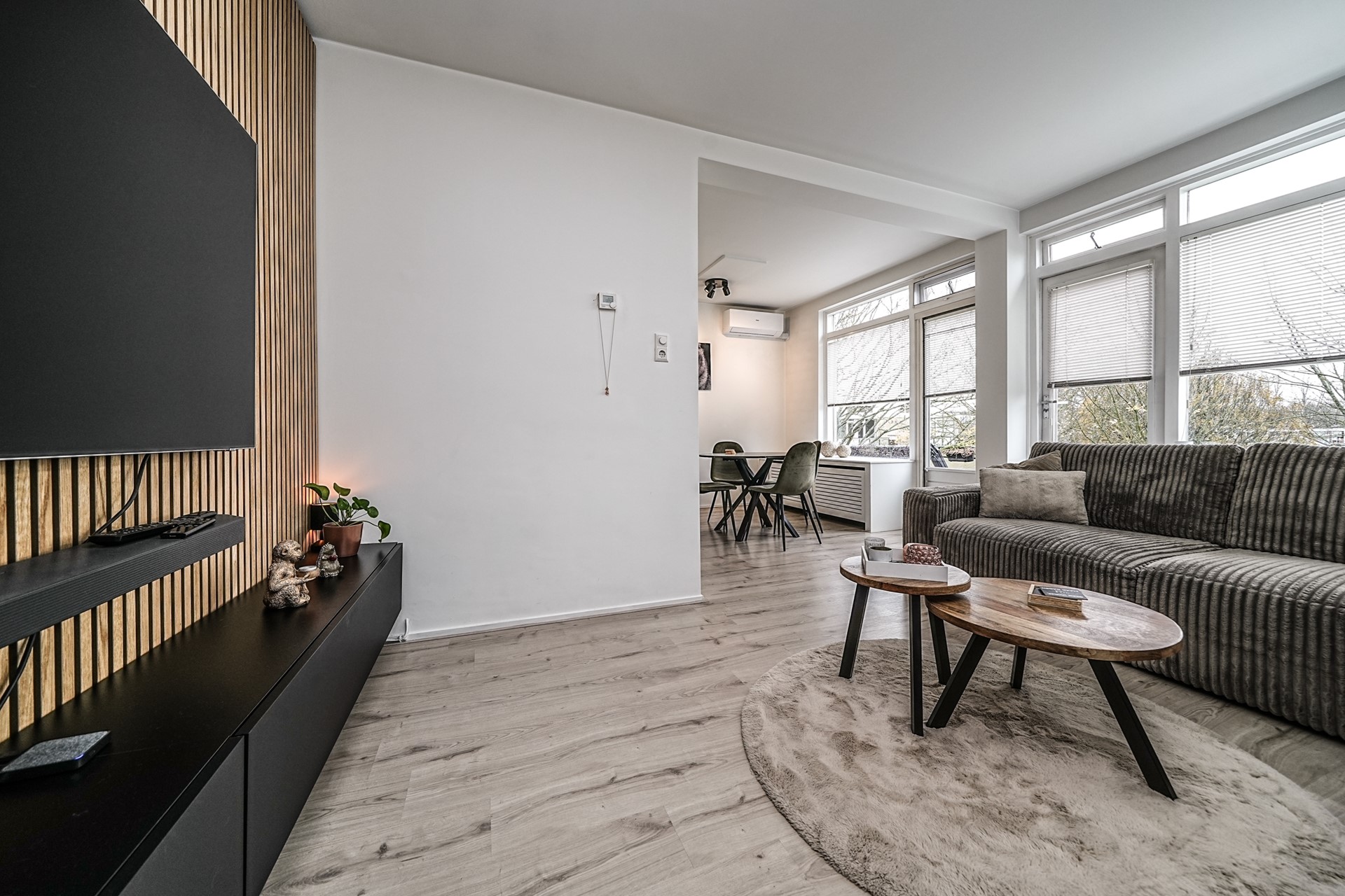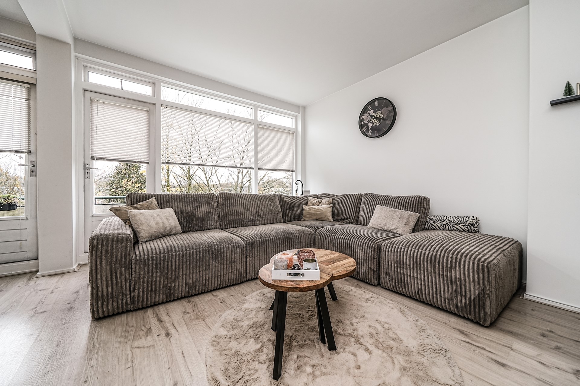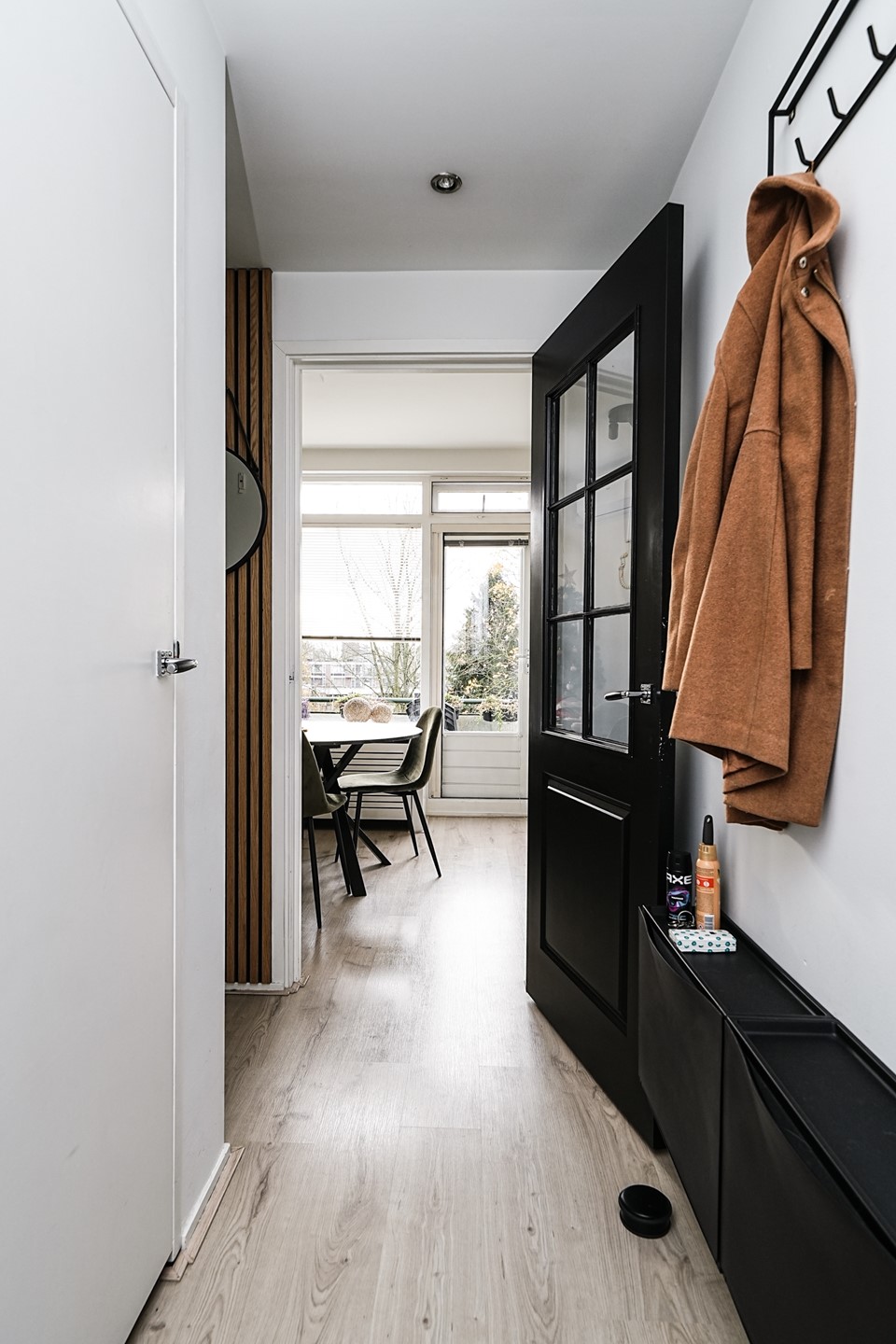 De verzorgde hal die toegang geeft tot alle vertrekken. De ruime woonkamer aan de achterzijde strekt zich uit over de volledige breedte van de woning en valt direct op door de grote ramen en directe toegang tot het balkon aan de achterzijde – een heerlijke plek voor een kop koffie in de ochtendzon.