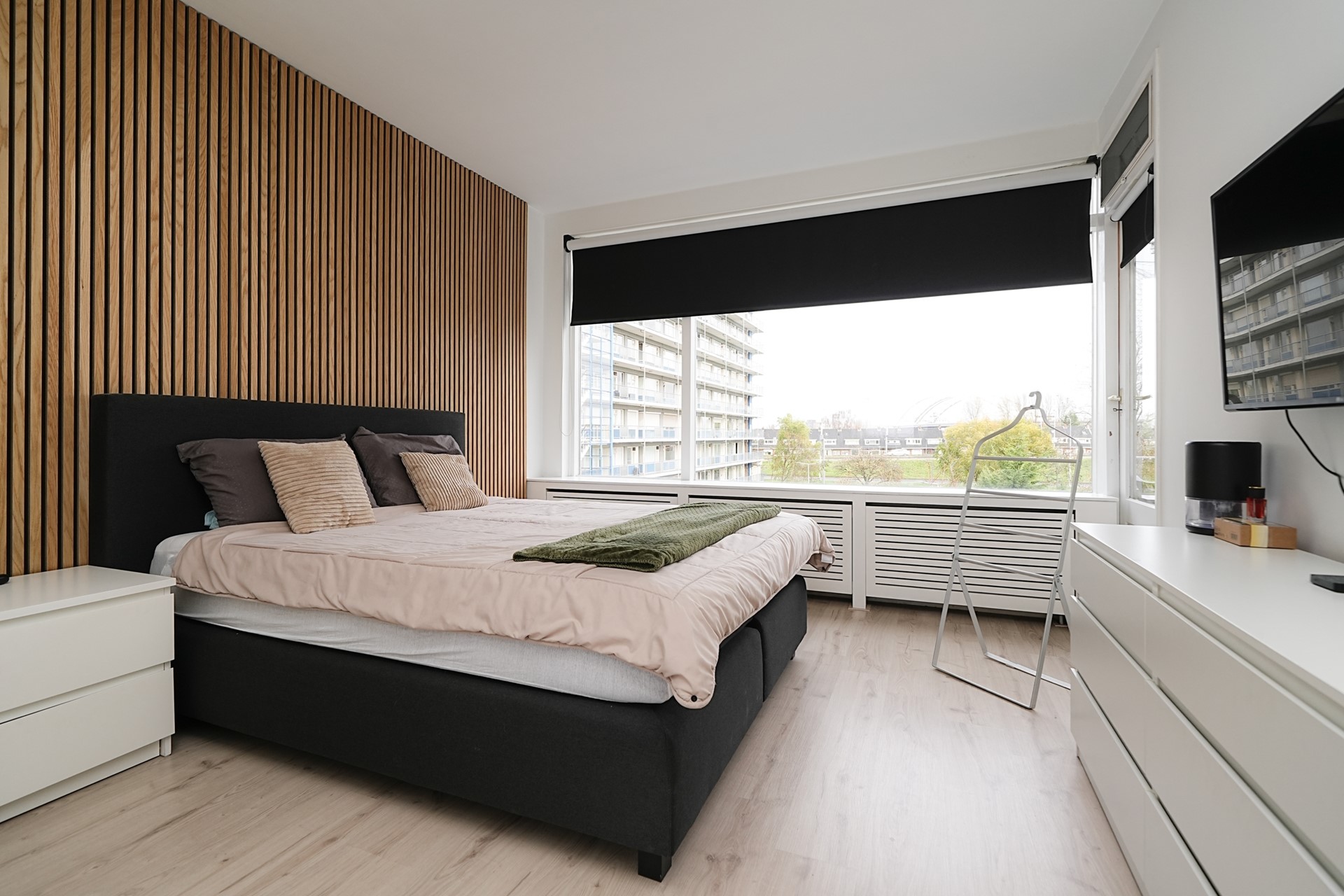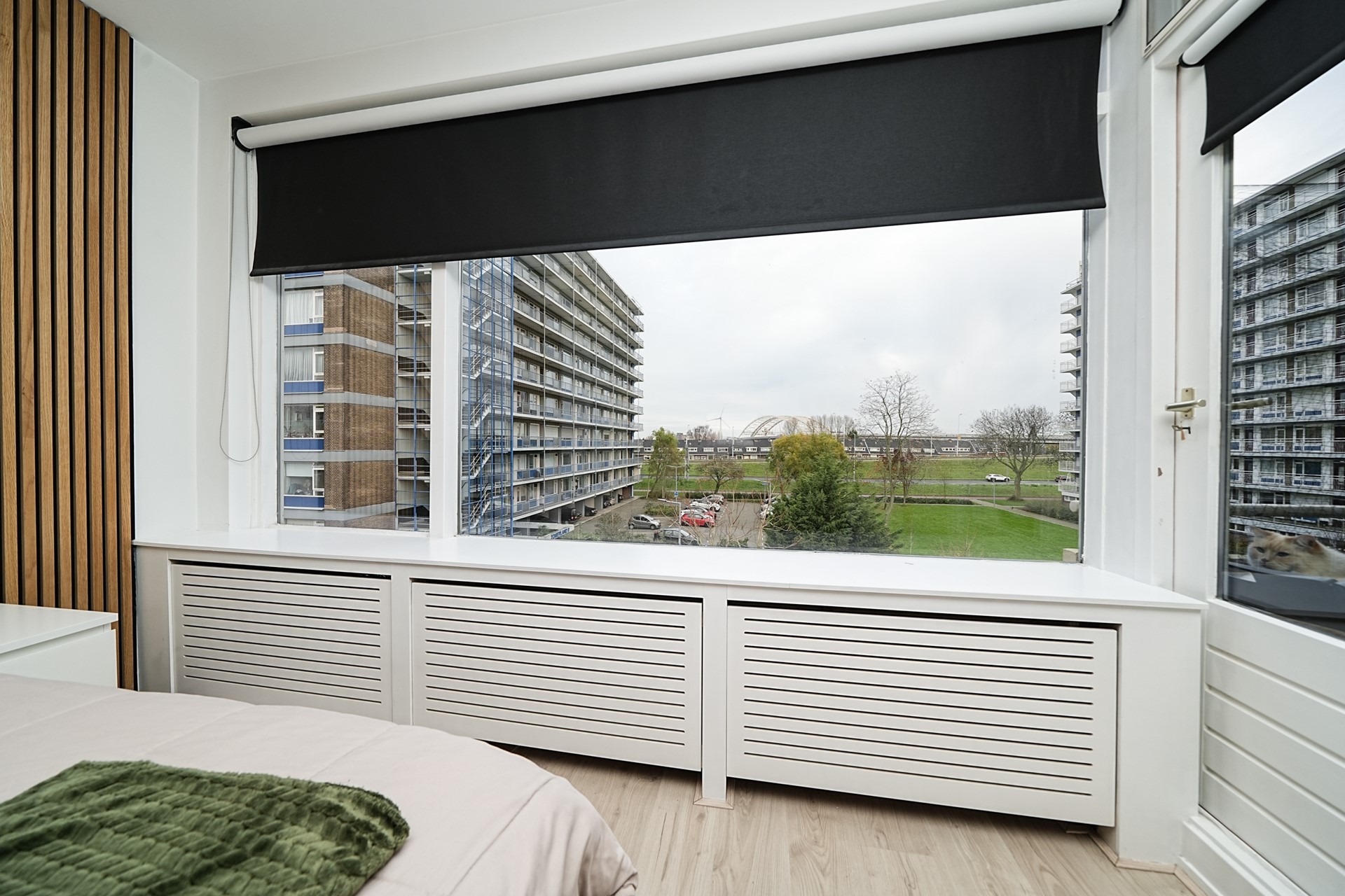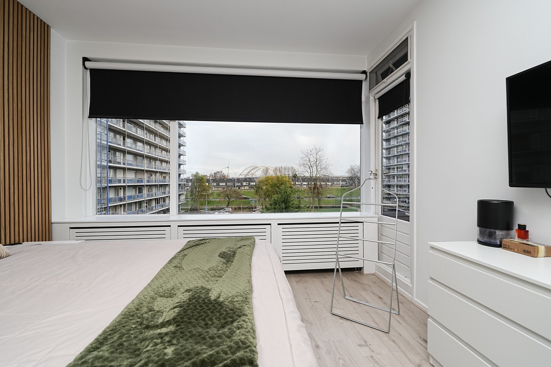 Aan de voorzijde bevinden zich twee slaapkamers, beide met toegang tot het balkon; de grootste slaapkamer biedt een fraai uitzicht op de Van Brienenoordbrug. Vanuit de hal bereikt u de badkamer met inloopdouche en wastafelmeubel en een separaat toilet met bidet.