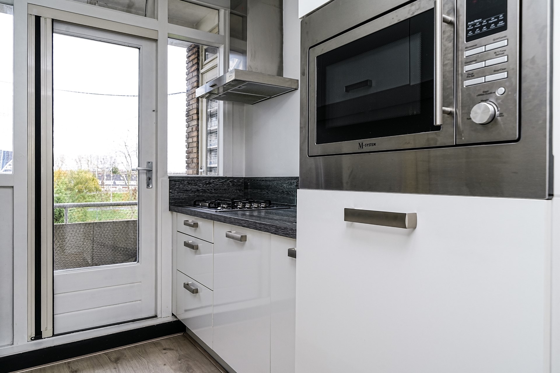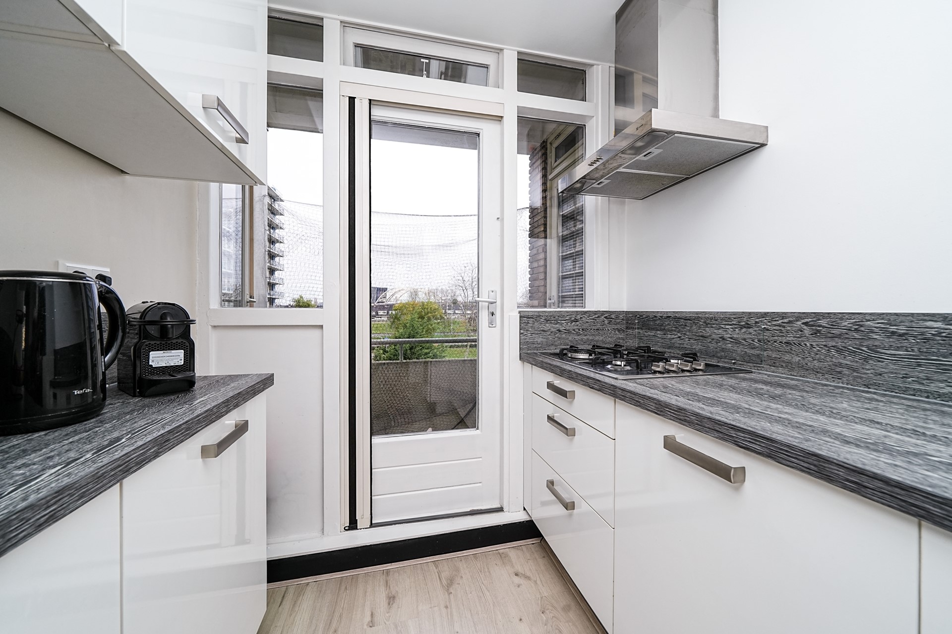 Op de 3e verdieping betreedt u de woning via de hal met bergkast voor wasmachine, droger en CV-opstelling; de meterkast bevindt zich in het trappenhuis. De lichte woonkamer aan de achterzijde beschikt over grote raampartijen en een eetgedeelte met toegang tot het ruime balkon. De inbouwkeuken (2016) ligt aan de voorzijde en biedt toegang tot het kleinere balkon.