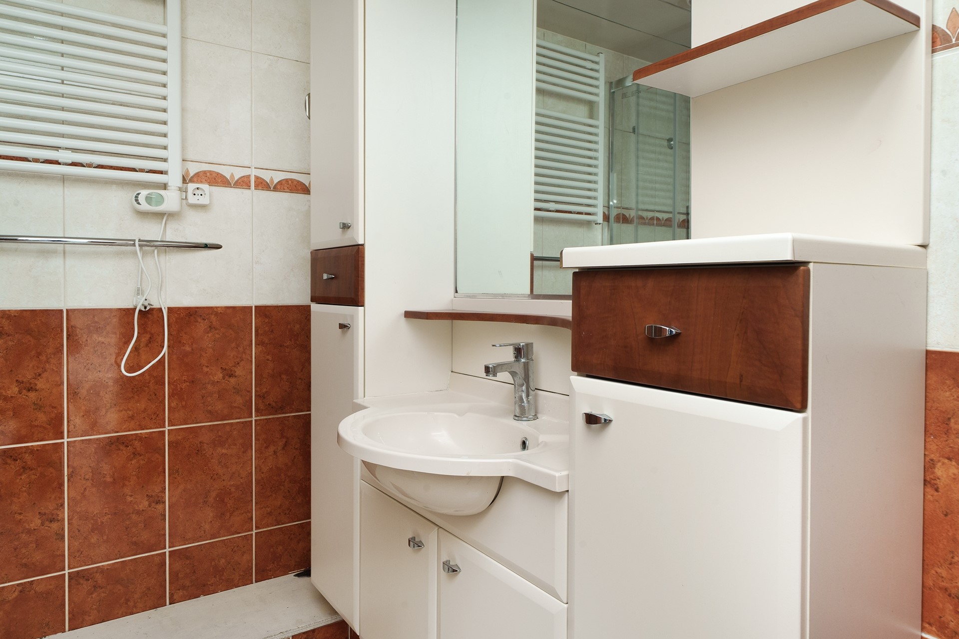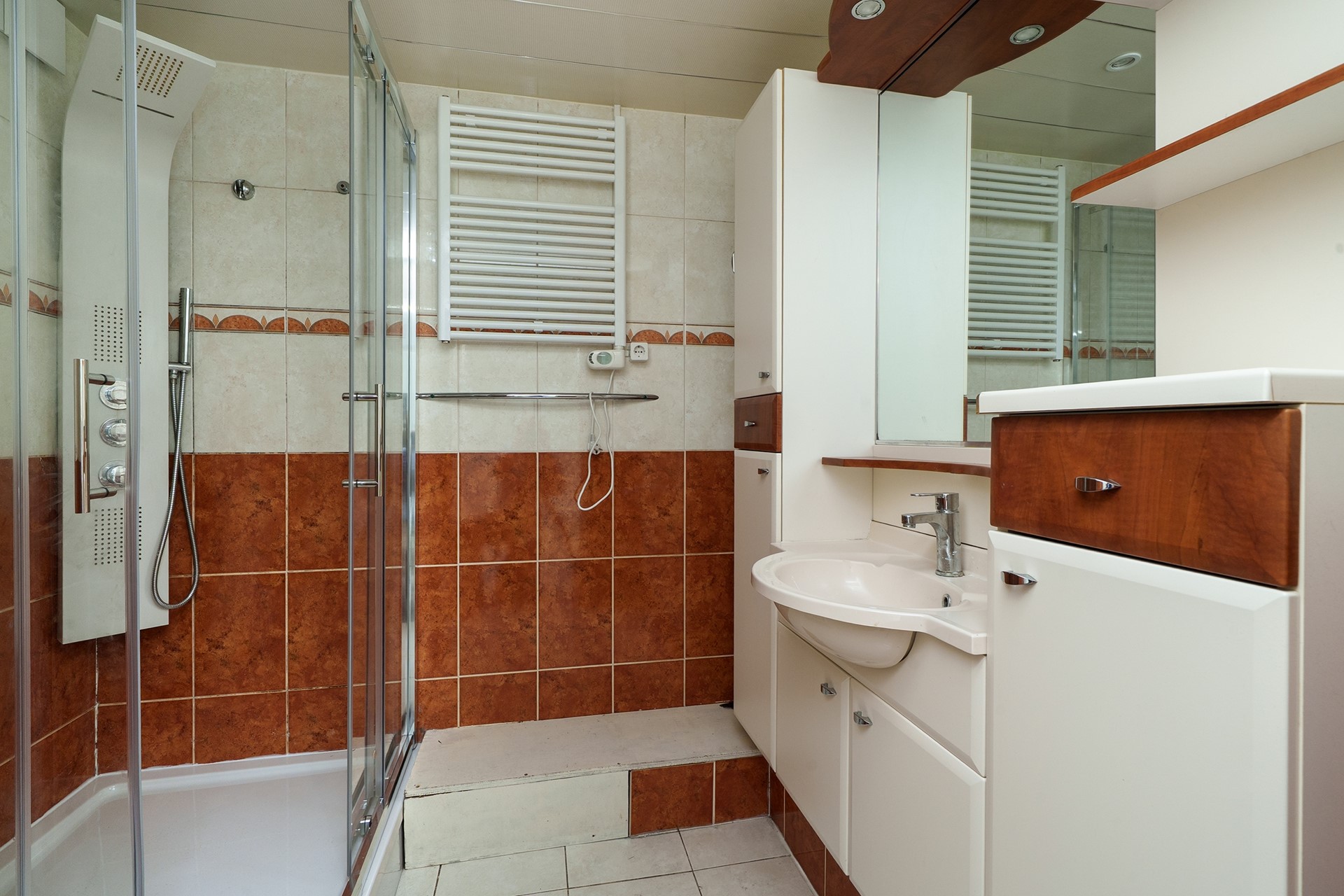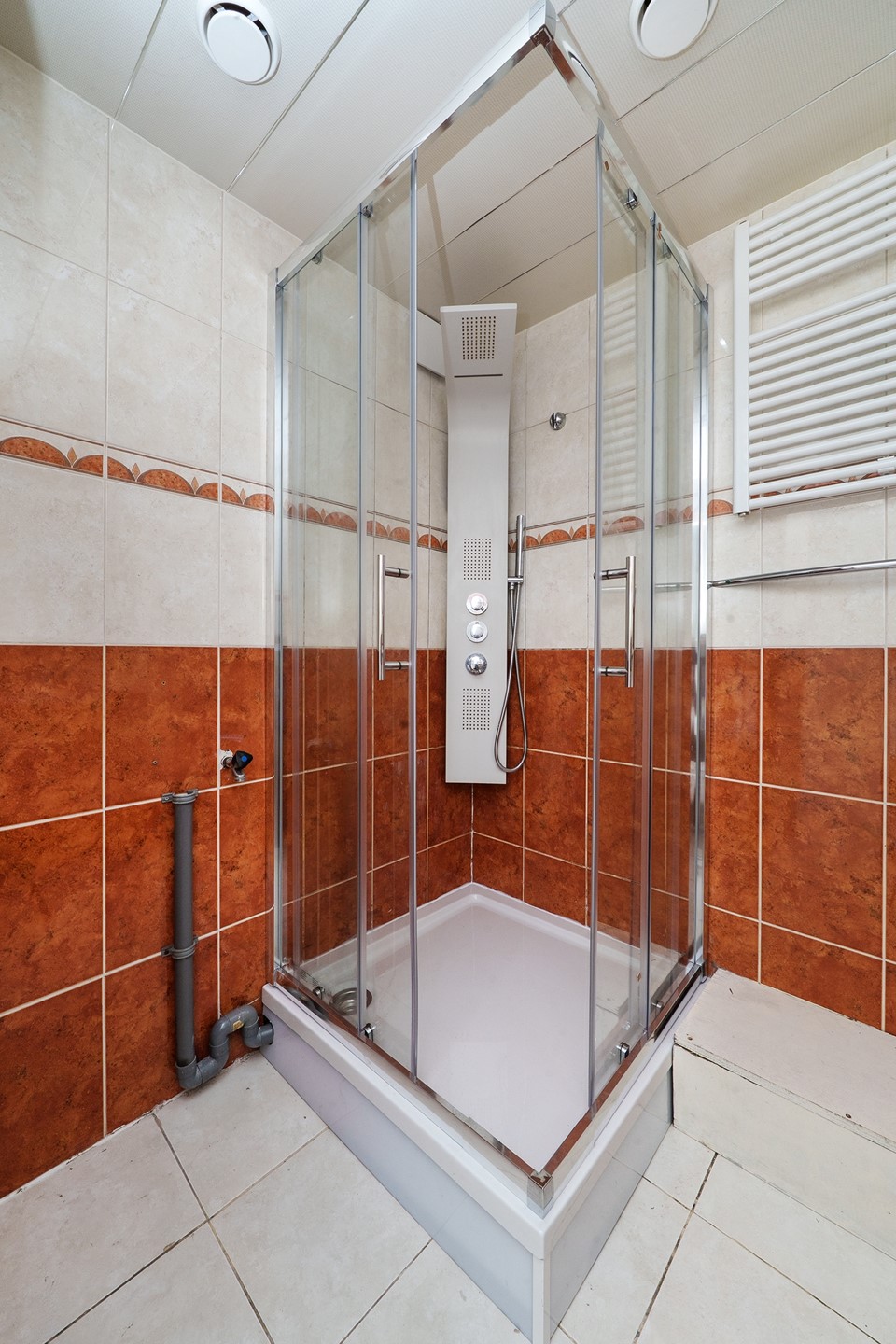 Badkamer: De badkamer is uitgerust met een moderne douche, wastafelmeubel en ruimte voor wasmachine en drogeropstelling.